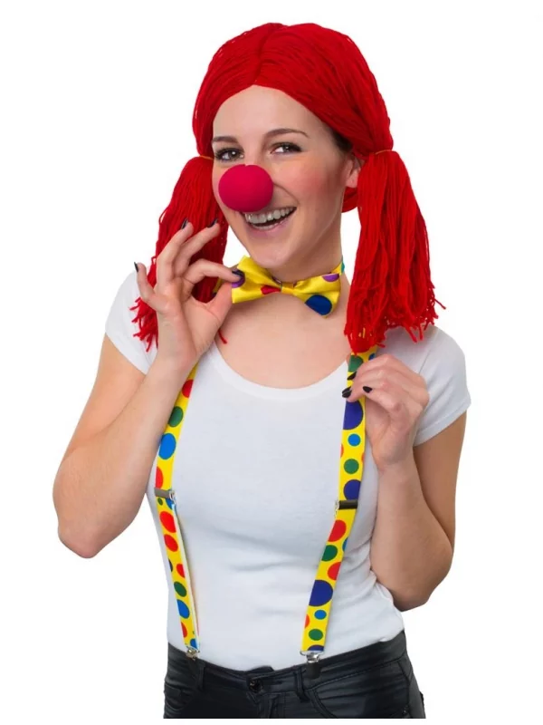 Accessoires de clown (bretelles, nœud-papillon et nez rouge)
