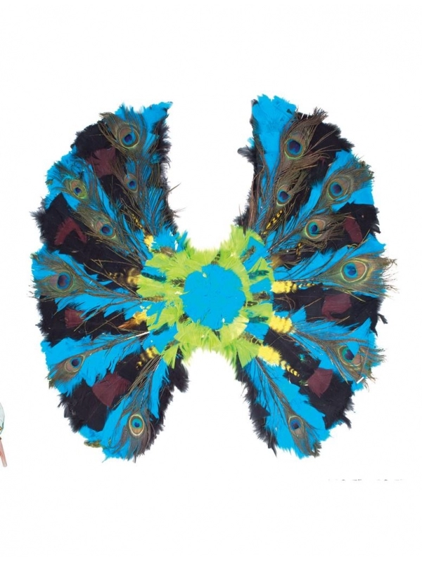 Paire d’ailes en plumes de paon pour femme avec élastique de maintien.