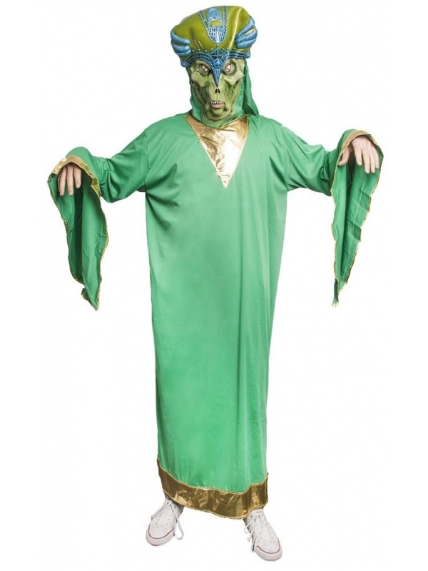 Ce déguisement d’alien pour homme est composé d’une longue tunique verte avec des bordures dorées sur les longues manches, le bas de la robe et au niveau du cou.