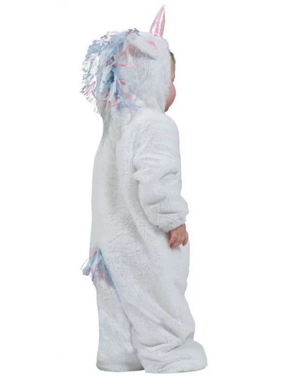 Le déguisement de Licorne pour fille, se compose d’une combinaison avec une capuche portant une corne rose, d’une queue et d’une crinière brillante.