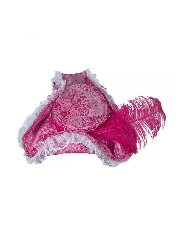 Cette tenue de pirate femme sera à compléter avec le tricorne rose, il arbore sur son pourtour une fine dentelle blanche et une plume rose. Afin d’assortir vos bottes à l’ensemble il vous suffira de les couvrir avec les poignets à bottes du même tissu que le chapeau et le corset.