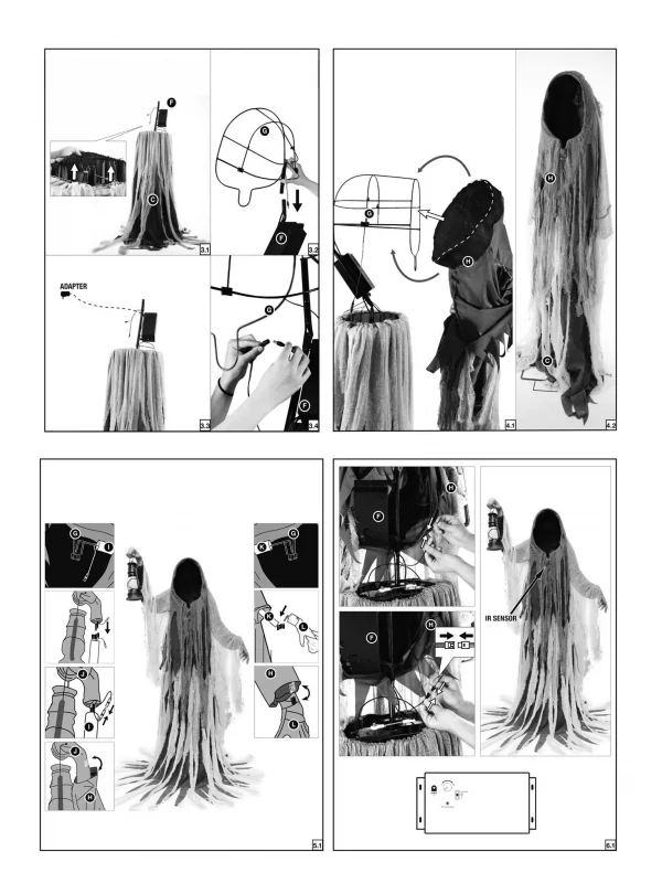 Il fonctionne sur secteur : AC 220-240 Volt. Enfin, il faut choisir le mode de fonctionnement : soit par un bouton marche/arrêt situé sous le socle, soit par un capteur sonore qui détecte les bruits ambiants. Quand elle s’active, l’automate Faucheuse bouge la tête et les bras, ouvre la bouche et dit des phrases glaçantes.