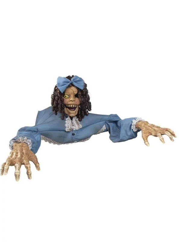 Cette décoration animée et sonore représente une poupée fantôme d’un autre siècle, coiffée avec des anglaises, vêtue d’une robe bleue avec de la dentelle blanche aux poignets et au col, et ayant des mains de sorcière vieillies par le temps. Ses yeux terrifiants et ses dents pointues feront frissonner vos invités.