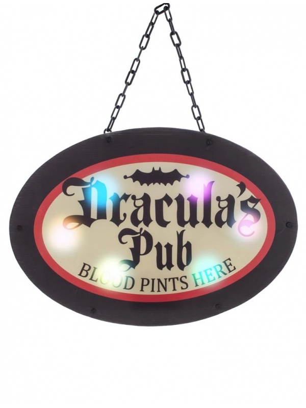 L’enseigne est lumineuse et fonctionne avec 3 piles AA incluses, ce qui vous permet de la suspendre Ă l’intĂ©rieur comme Ă l’extĂ©rieur. N’oubliez pas de prĂ©venir vos amis vampires, ils seront ravis de se retrouver dans votre pub de Dracula !