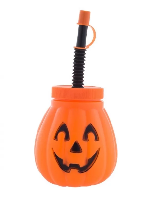 Le gobelet citrouille orange est en pvc, possède un couvercle et une paille.