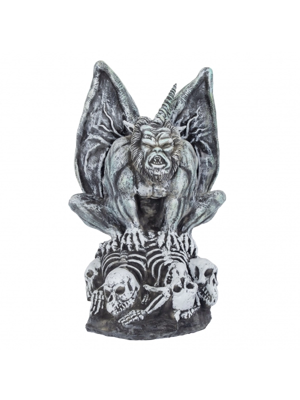 Gargouille monstre avec ailes, assis sur têtes de morts et ossements.