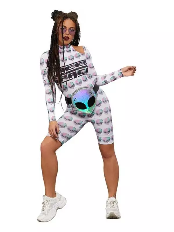 Ici, c’est une combinaison moulante avec des manches longues et une épaules dénudée. Elle est blanche et porte un motif de tête d’alien, ainsi vous pourrez jouer les extra-terrestres sexy.