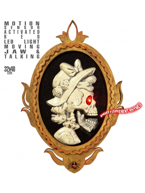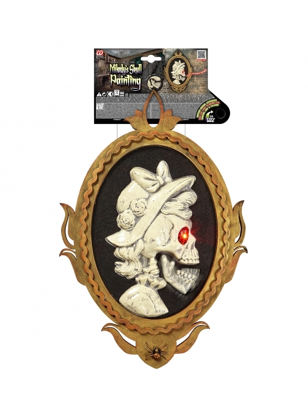 Superbe cadre photo pour Halloween à fixer au mur ! Il s’agit de la tête squelette d’un majordome avec un haut de forme.