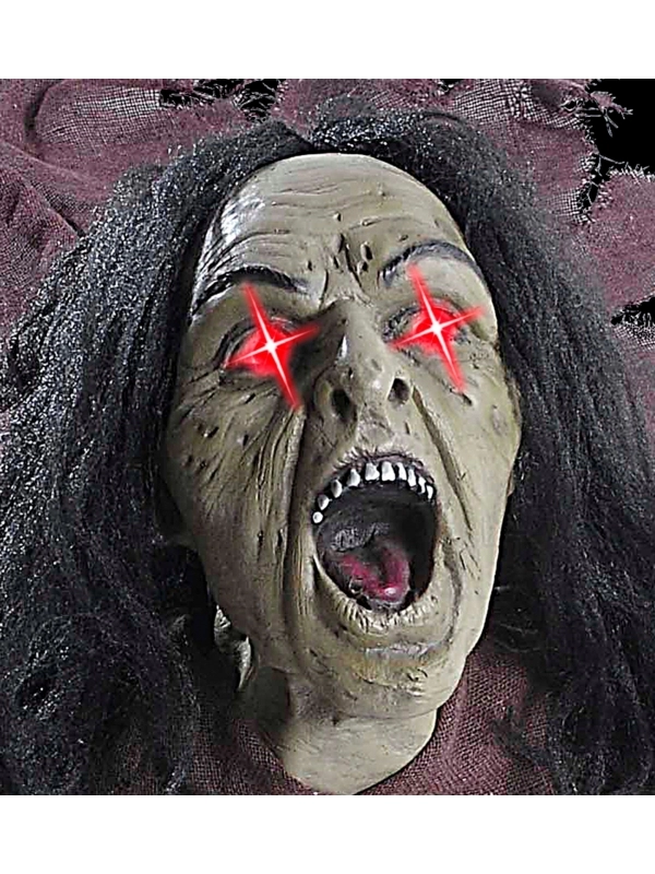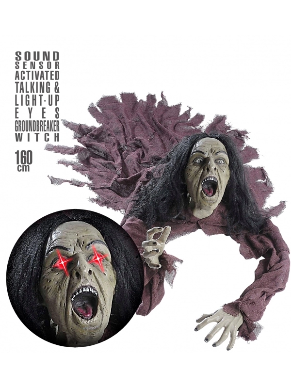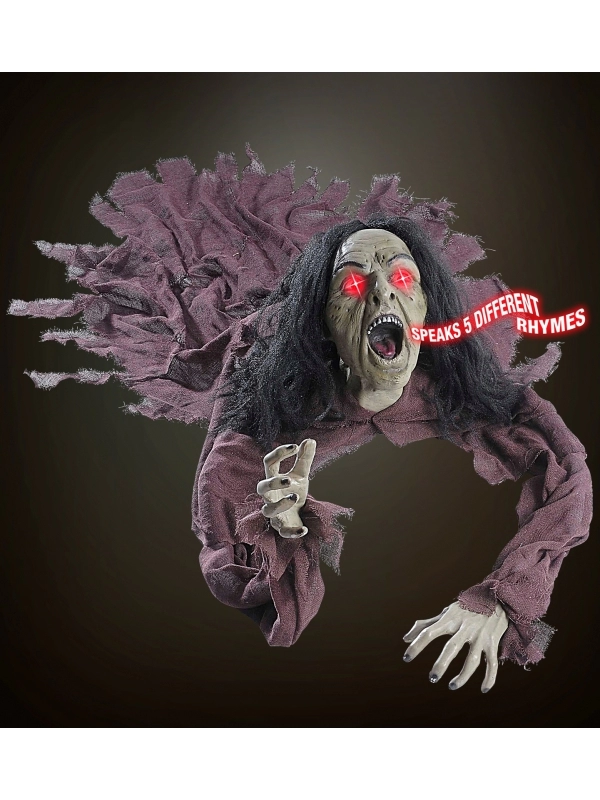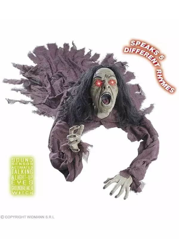 La sorcière animée parle cinq comptines différentes et émet des cris stridents qui surprendront tous ceux qui s’approcheront d’elle. Les yeux lumineux ajoutent à l’effet terrifiant et renforcent l’atmosphère effrayante de votre soirée d’Halloween.