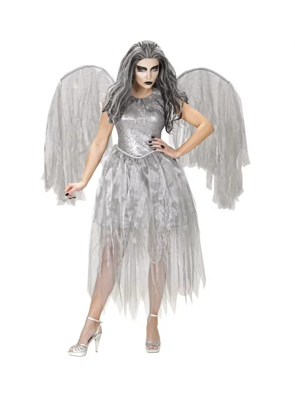 Déguisement ange sombre, femme, gris (robe, ailes)