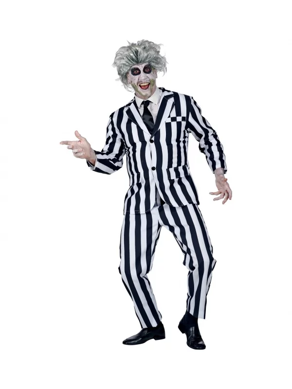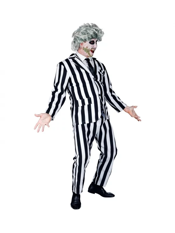 Ce déguisement consiste en une veste et un pantalon aux rayures verticales en noir et blanc, puis une cravate noire.
