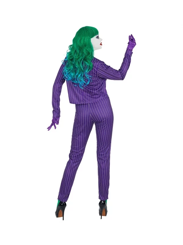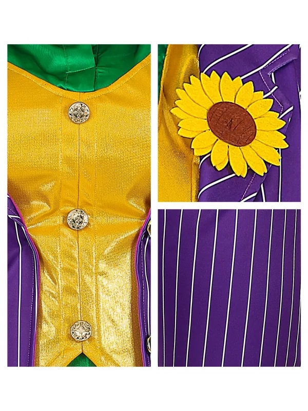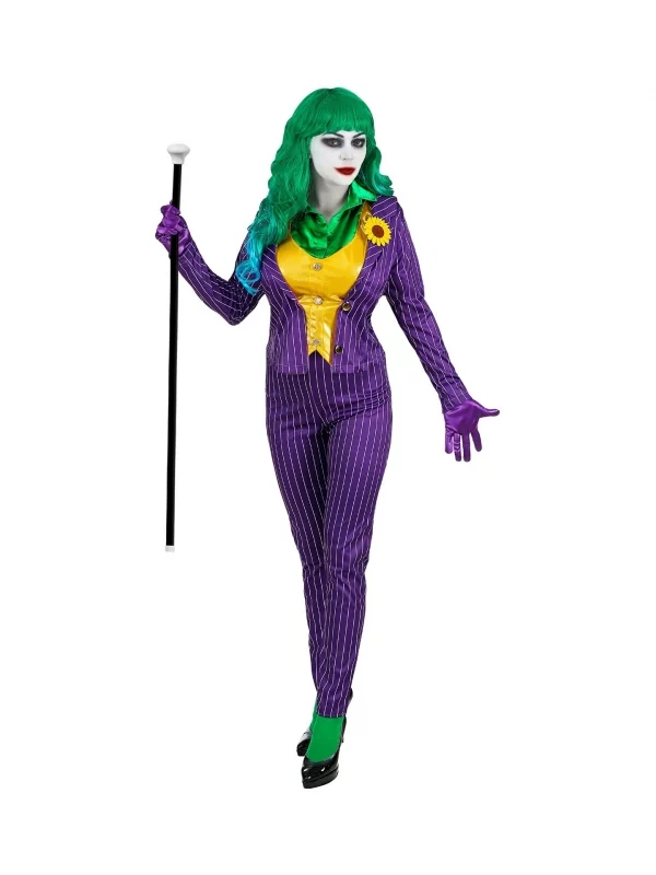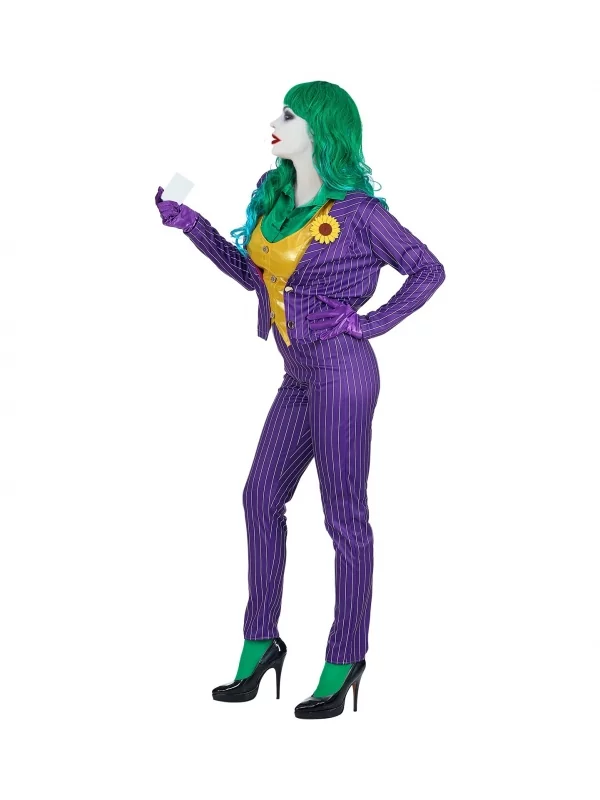 Cela correspond parfaitement aux traits de caractères de la femme clown maléfique. Des gants violets et une grande fleur de boutonnière jaune, bien visible, apportent touche particulièrement réussie.