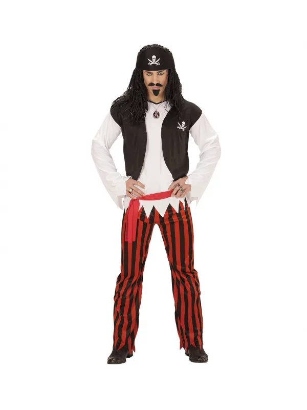 Cette tenue de bandits des mers vous montre sous un air de vilain merle, grâce au style désinvolte de la chemise avec veston et du pantalon rayé noir et rouge. Vous intégrez facilement le clan des boucaniers et des loups de mers avec le bandeau noir agrémenté du Jolly Roger.