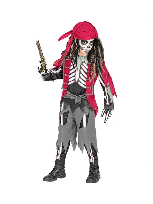 Disponible en tailles allant de 4 ans à 13 ans, ce déguisement de Pirate Squelette est d’une très belle facture. La veste rouge avec une chemise noire attachée arbore une impression de squelette, tandis que le pantalon noir est imprimé d’un squelette blanc. Pour ajouter une touche de réalisme, le surpantalon gris déchiré complète parfaitement le look du pirate, du boucanier ou du corsaire.