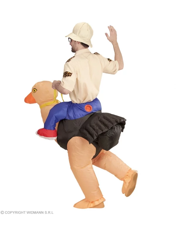 Le bas du costume représente une autruche gonflable, avec des fausses jambes autour de son cou pour donner l’illusion que vous êtes porté sur son dos. Le costume est équipé de rênes pour accentuer l’illusion et pour parfaire le look d’explorateur, un chapeau est également inclus. Ce déguisement est facile à porter et ne nécessite aucun maquillage ni accessoire supplémentaire pour compléter le look.