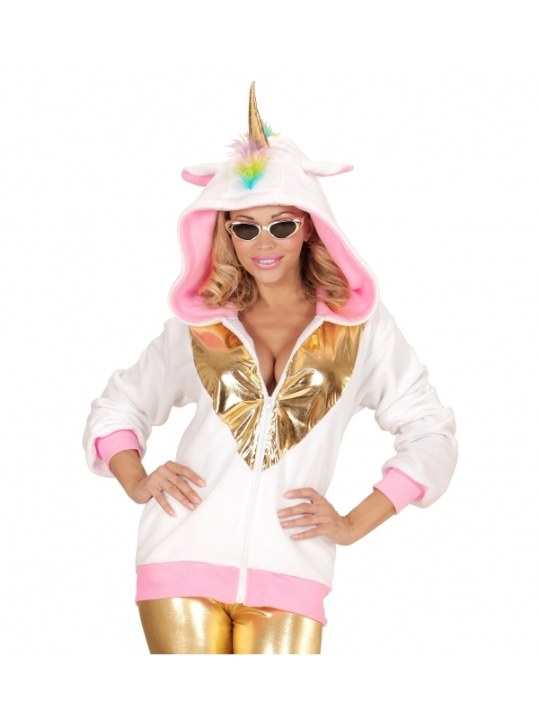 Avec sa capuche en forme de tête de licorne, cette polaire est disponible en blanc, doré et arc-en-ciel. Elle est conçue en 100 % polyester pour un confort optimal. Les tailles disponibles sont S/M et L/XL, et elle convient aux femmes, hommes et adolescents.